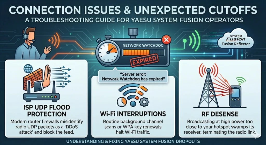 Unlike services such as WhatsApp or FaceTimeโwhich use intelligent buffering to smooth out network hiccupsโdigital amateur radio streams consist of raw, unbuffered UDP data. Your hotspot sends a constant stream of packets directly at the server. Any micro-interruption in your home network violates the watchdog threshold, causing an instant disconnection.
